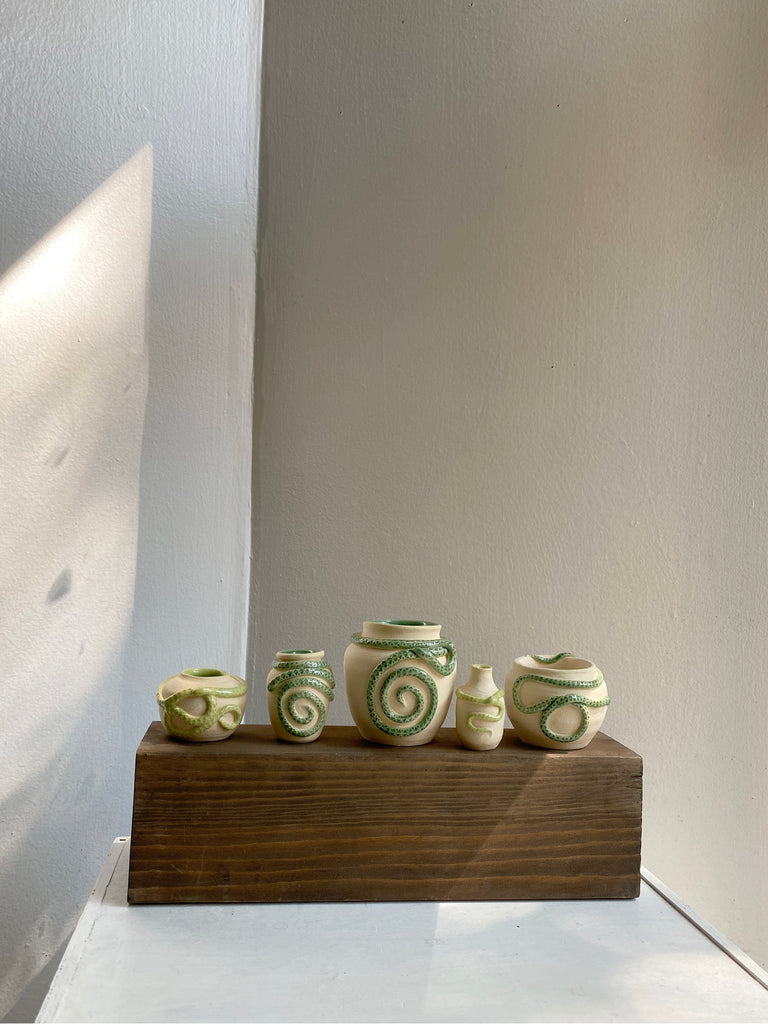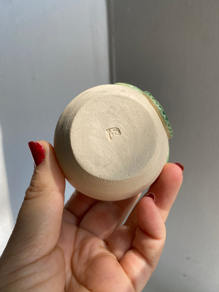 One of a kind wheel thrown mini stoneware pot with hand coiled and detailed snake.