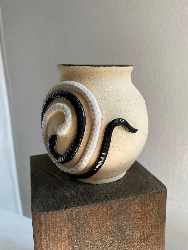 One of a kind wheel thrown stoneware vessel with hand coiled and detailed black and white snakes. Raw clay is a pretty natural buff color.