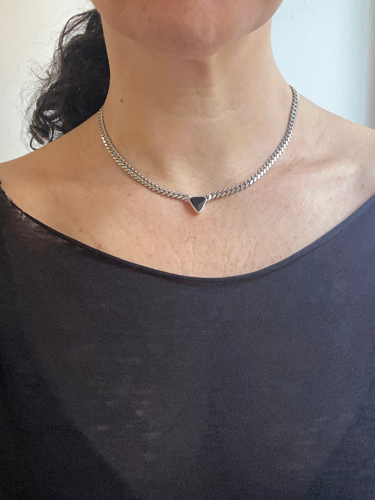 Vintage cuban link chain with a natural tourmaline tip bezel set in the center to make a modern banger. This chain has heft! It's also vintage Ralph Lauren which is cool.