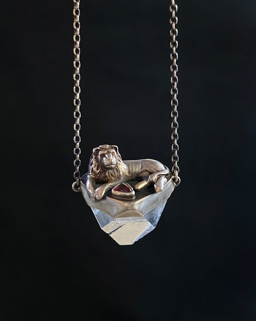 One of a kind sterling silver pendant alchemized from a single vintage lion earring, a natural apophyllite tip, and a garnet.