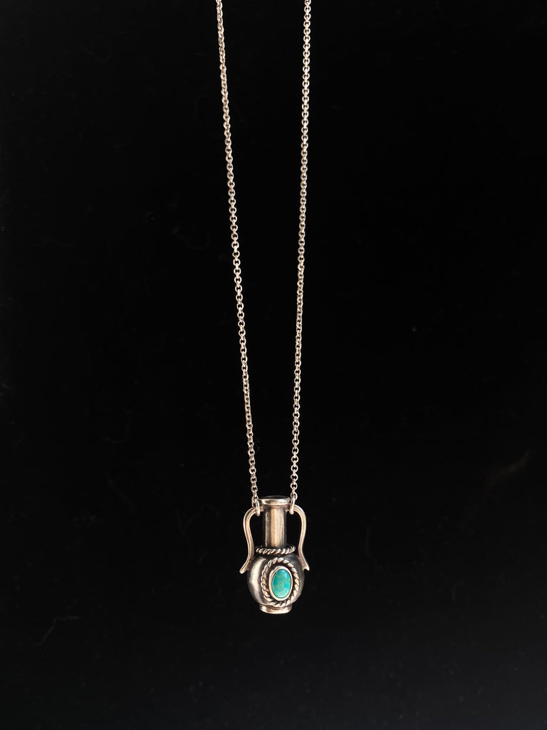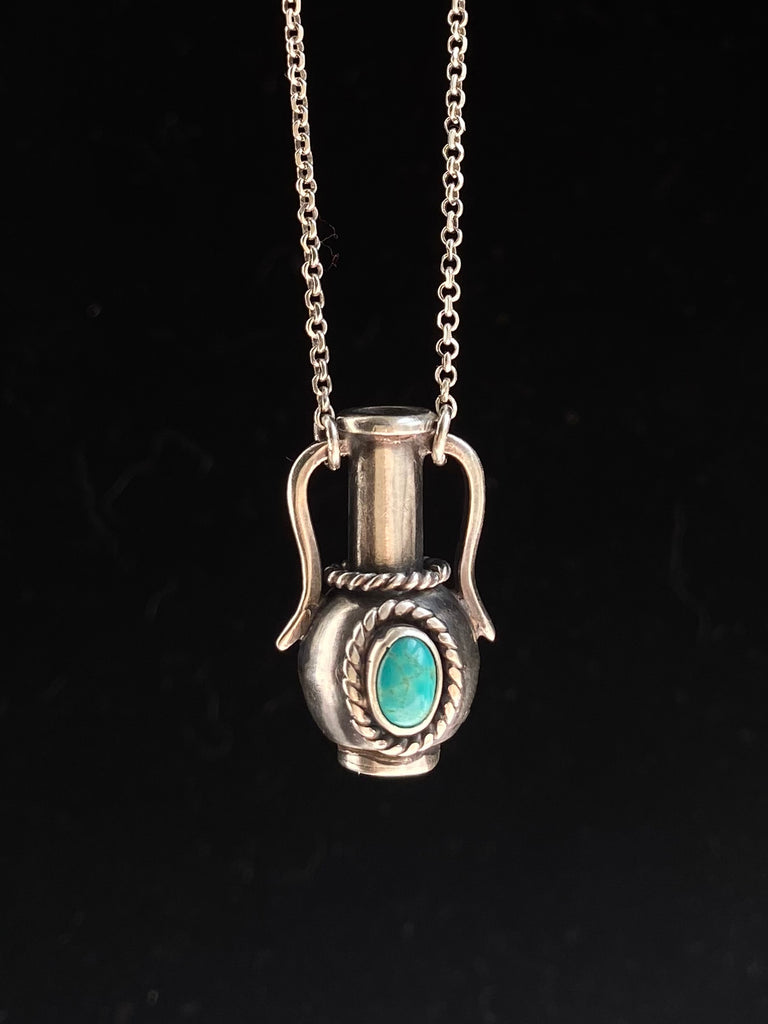One of a kind handmade vessel pendant necklace. Bezel set turquoise. Hollow form.